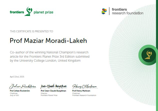 یکی از جوایز به مقاله زیر از کمیسیون لنست کانت داون برای تغییر اقلیم و سلامت تعلق گرفته است که دکتر مازیار مرادی لاکه، استاد مرکز تحقیقات گوارش و کبد نیز یکی از نویسندگان مقاله مزبور است؛ نویسنده اول مقاله مزبور، دکتر مارینا رومانلو بوده است.